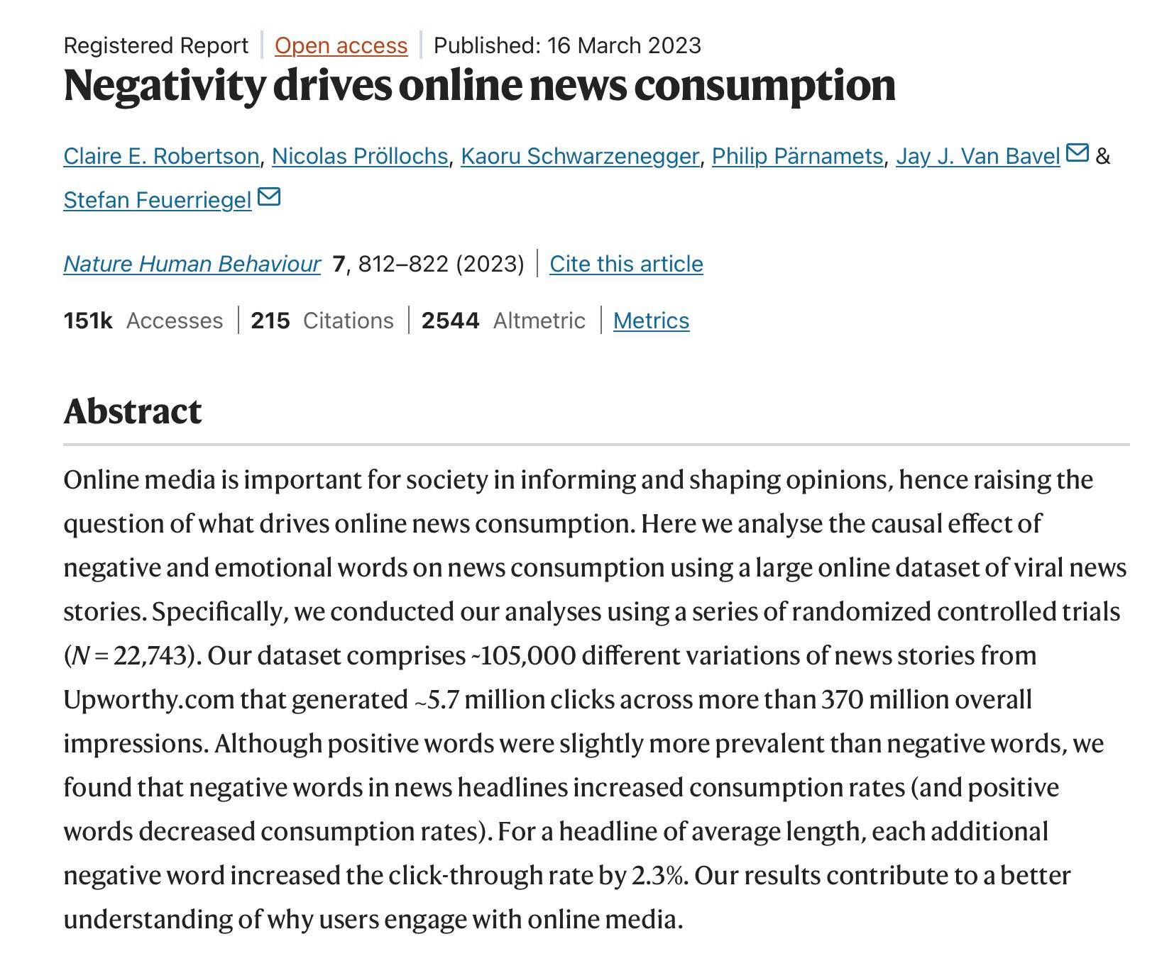 A ​2023 study​ of 105,000 headlines and 370 million impressions found that negative words drive consumption.