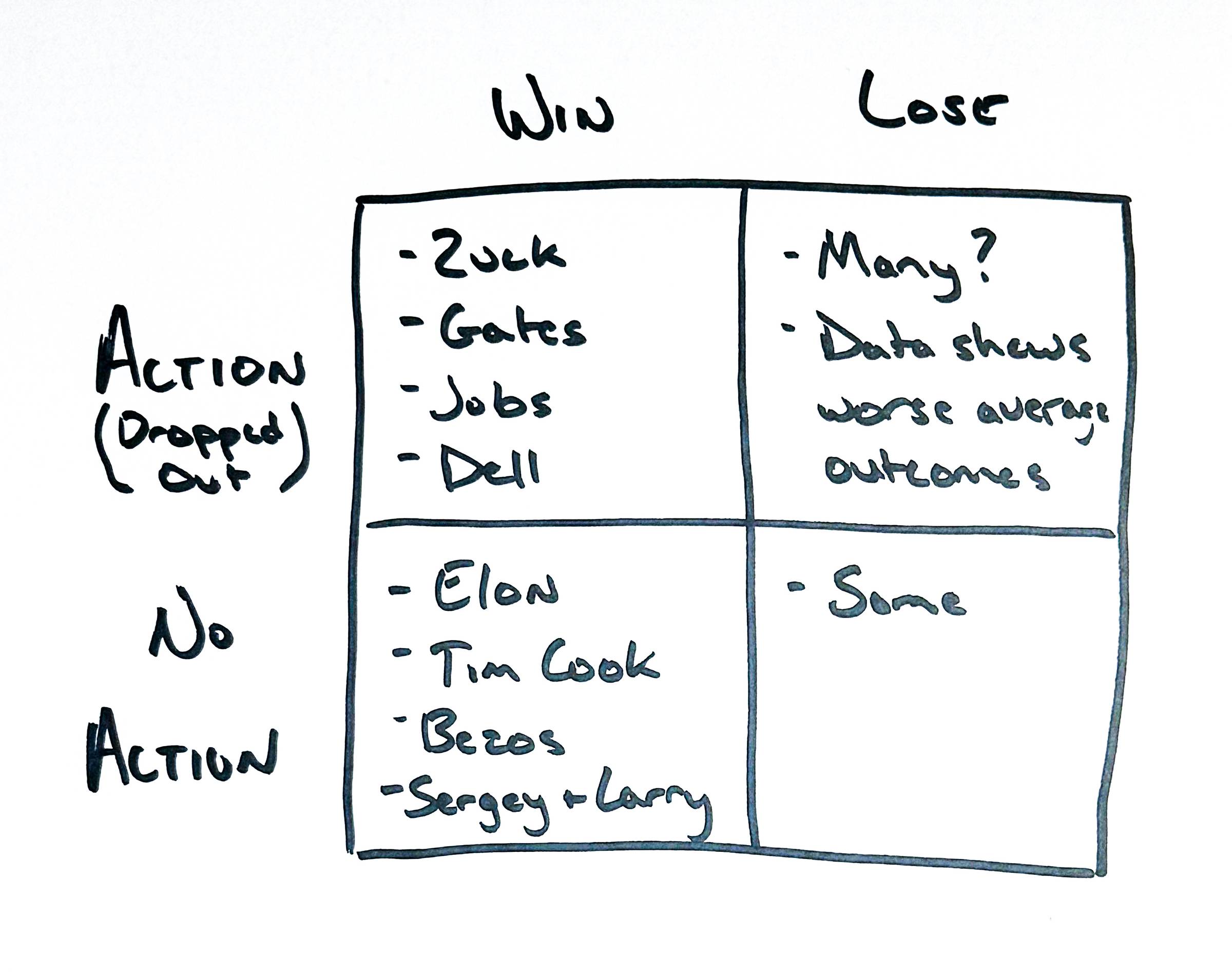 - No Action, Win: Those who got their college degree and succeeded on an extraordinary level. This list includes Elon Musk, Tim Cook, Jeff Bezos, Sergey Brin, and Larry Page.