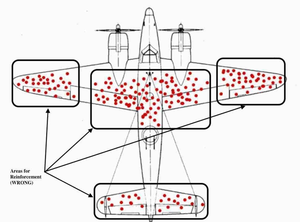The unharmed regions were the most vulnerable, he reasoned. This was where the fatal damage was incurred—where bullets caused planes to never make it home.