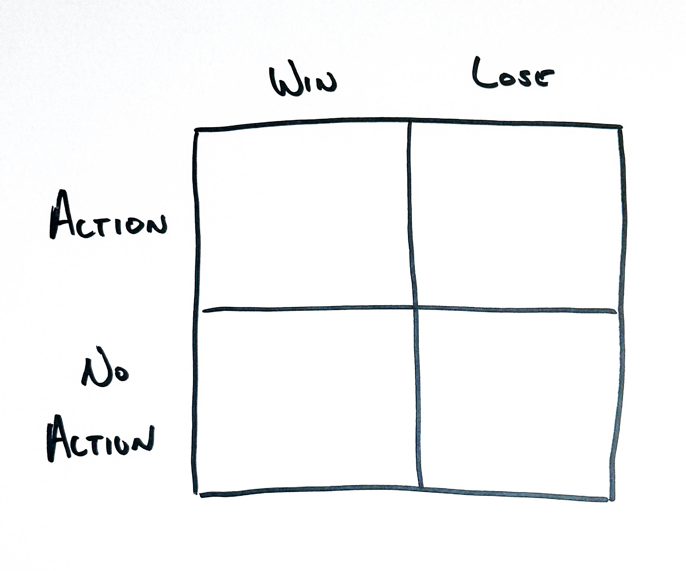 The Top-Left (Action, Win) is typically the easily seen data. It's what we read books about. It's what we celebrate. Staring at this quadrant and ignoring the others is how Survivorship Bias thrives.